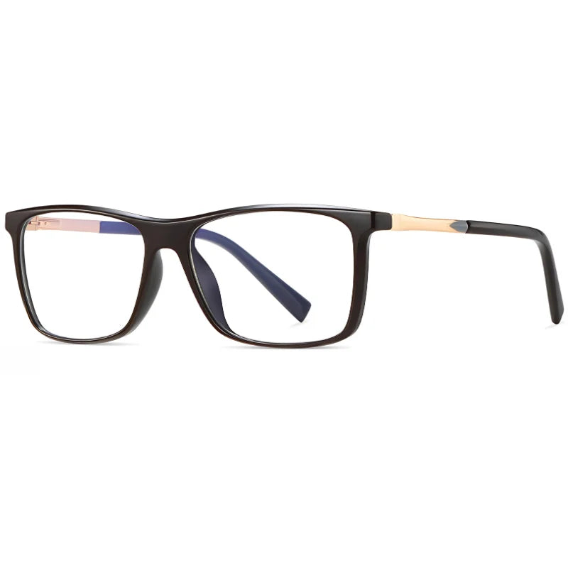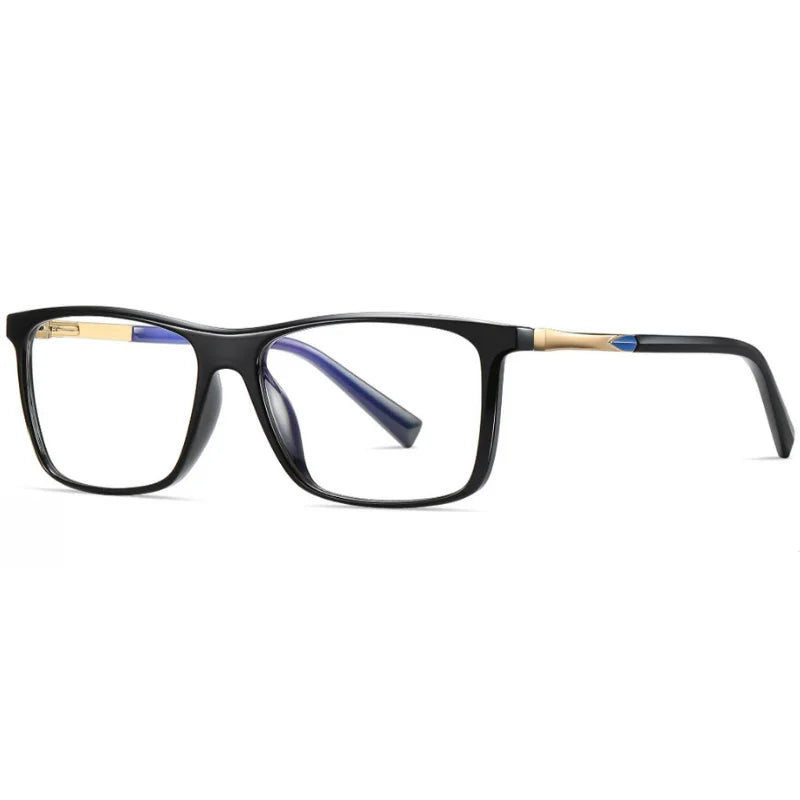 Esta montura tiene un diseño rectangular clásico, con un marco negro que transmite sobriedad y seguridad. Los detalles metálicos en las varillas aportan un toque moderno y elegante, mientras que su estructura sólida la hace perfecta para un look profesional y versátil.