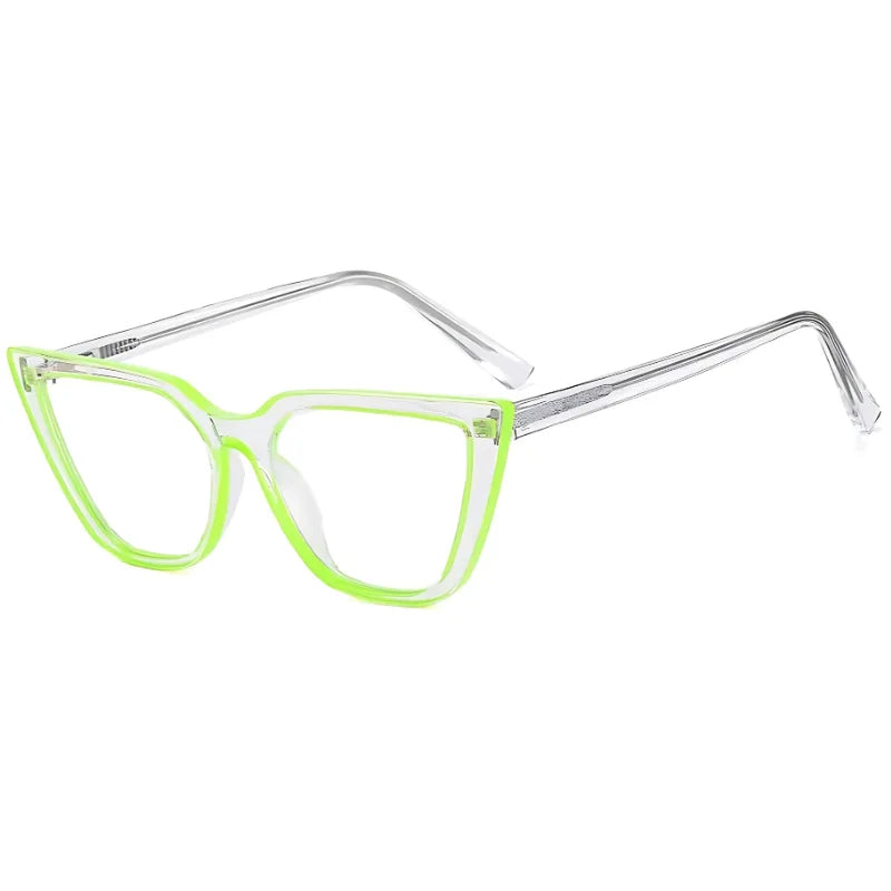 Esta montura tiene un diseño cat-eye de gran tamaño, con bordes definidos que resaltan un estilo atrevido y moderno. Su frente en acetato con acabado translúcido aporta frescura y ligereza visual, mientras que las varillas rectas y delgadas equilibran el diseño voluminoso del frente.