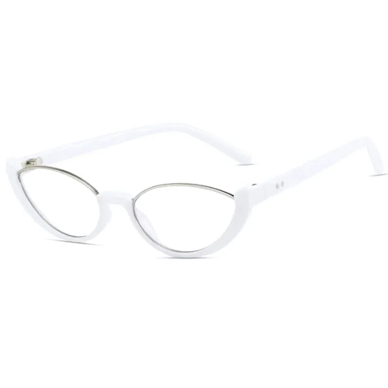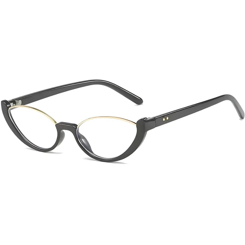 Esta montura tiene un estilo retro en forma de ojo de gato, con un diseño delgado en la parte superior reforzado por un detalle metálico que aporta un aire elegante. El frente en acetato brinda solidez y carácter, mientras que las varillas mantienen una línea clásica con remaches discretos.